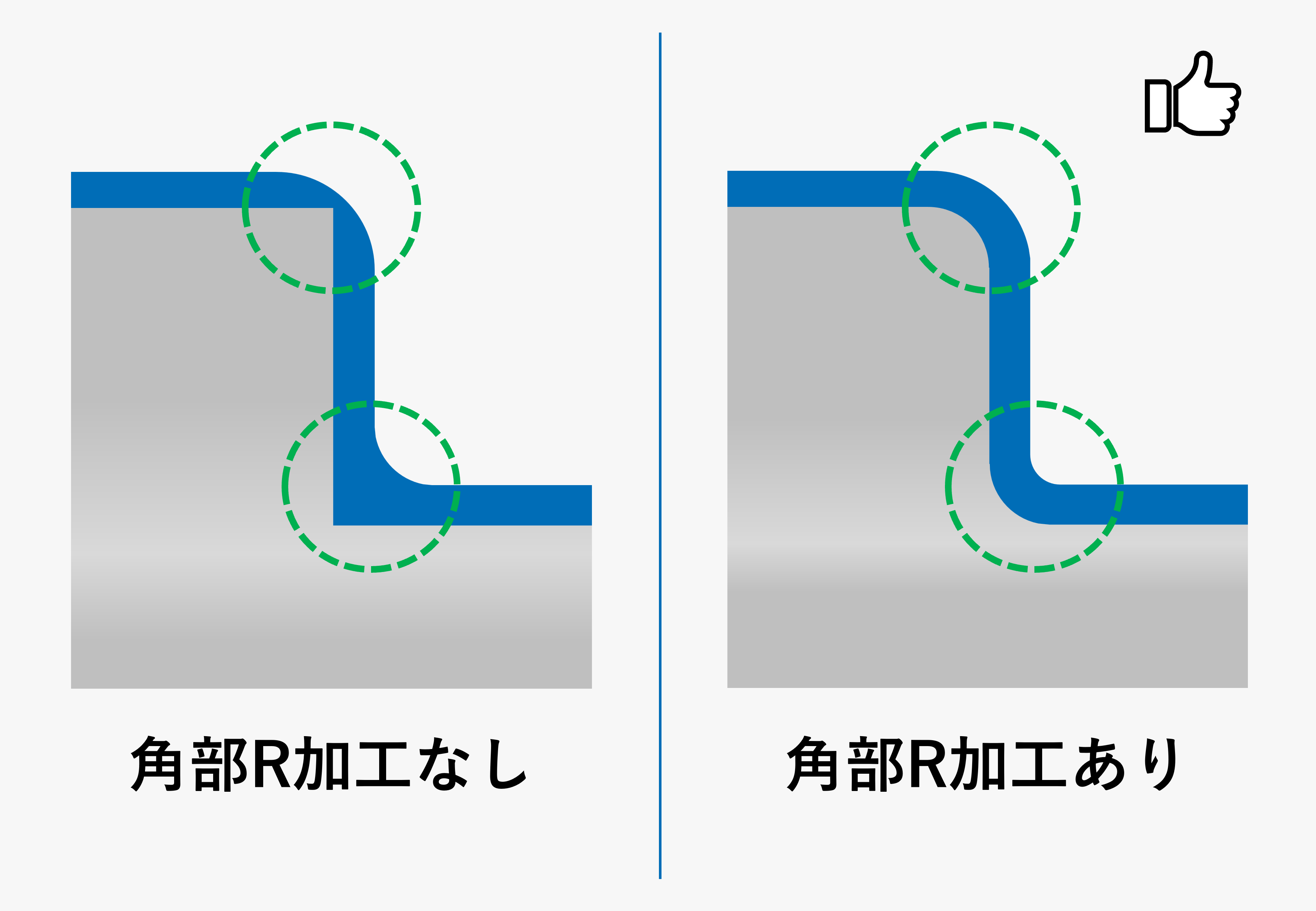 基材に角部がある場合、平坦な部分と比べてコーティング膜厚ばらつきや、塗膜の収縮応力による割れ・剥離などが発生する可能性があります。これらの問題は、あらかじめ角部にR加工を施すことで軽減できる場合があります。