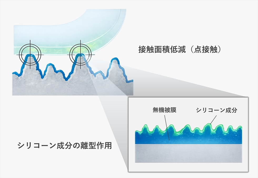 シリコーンは、表面張力が低く、ほとんどの有機物と非相溶のため、高い離型性能を有しています。NonStick Coatingでは、ベースとなる無機質の被膜に含まれるシリコーン系離型成分が塗膜表面へ徐々に供給されることで、安定した離型効果を発揮します。